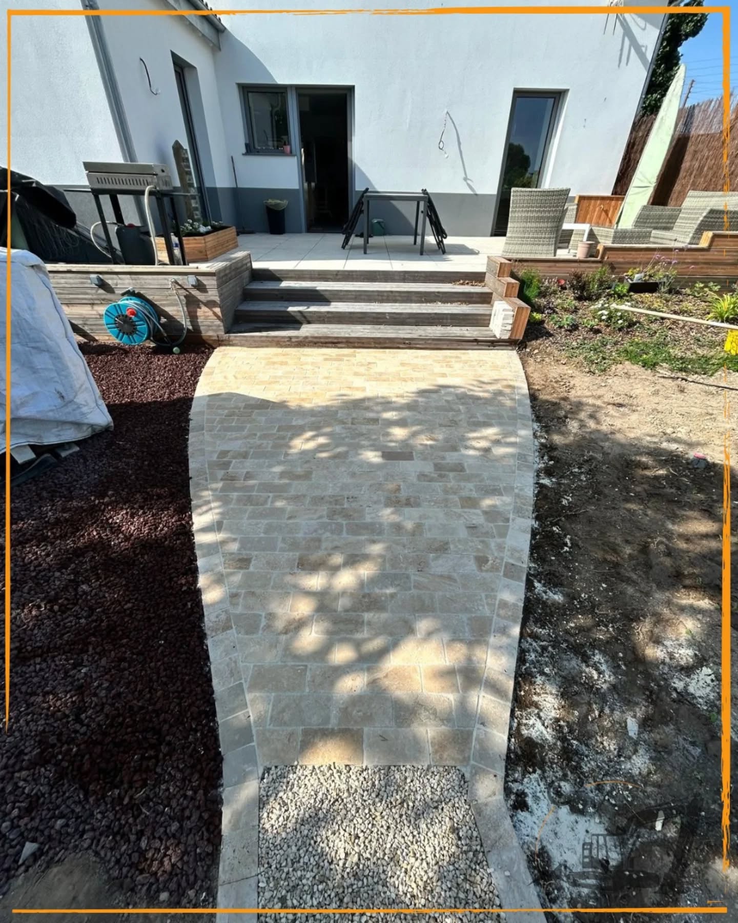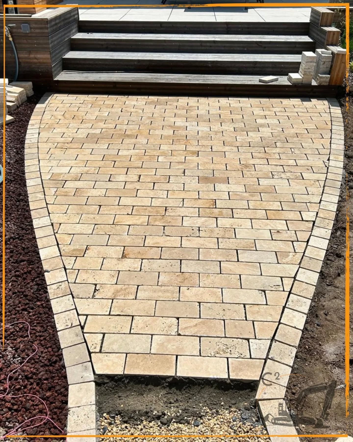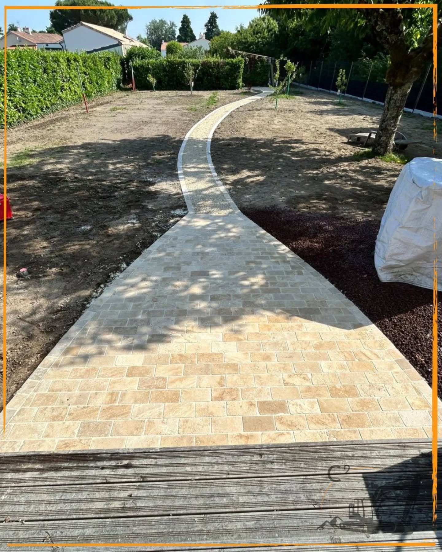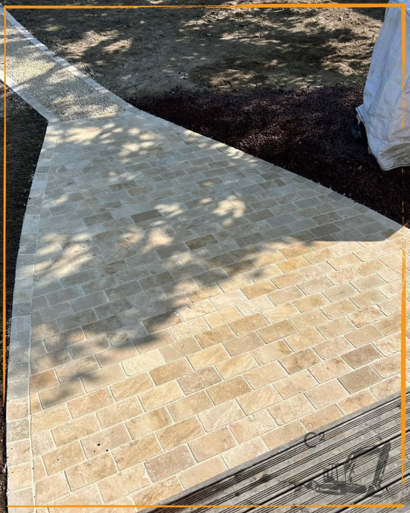 Création d’un chemin d’accès avec pose d’une chaînette en pavés de travertin 10×10